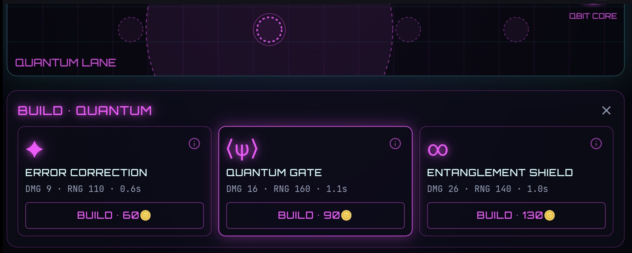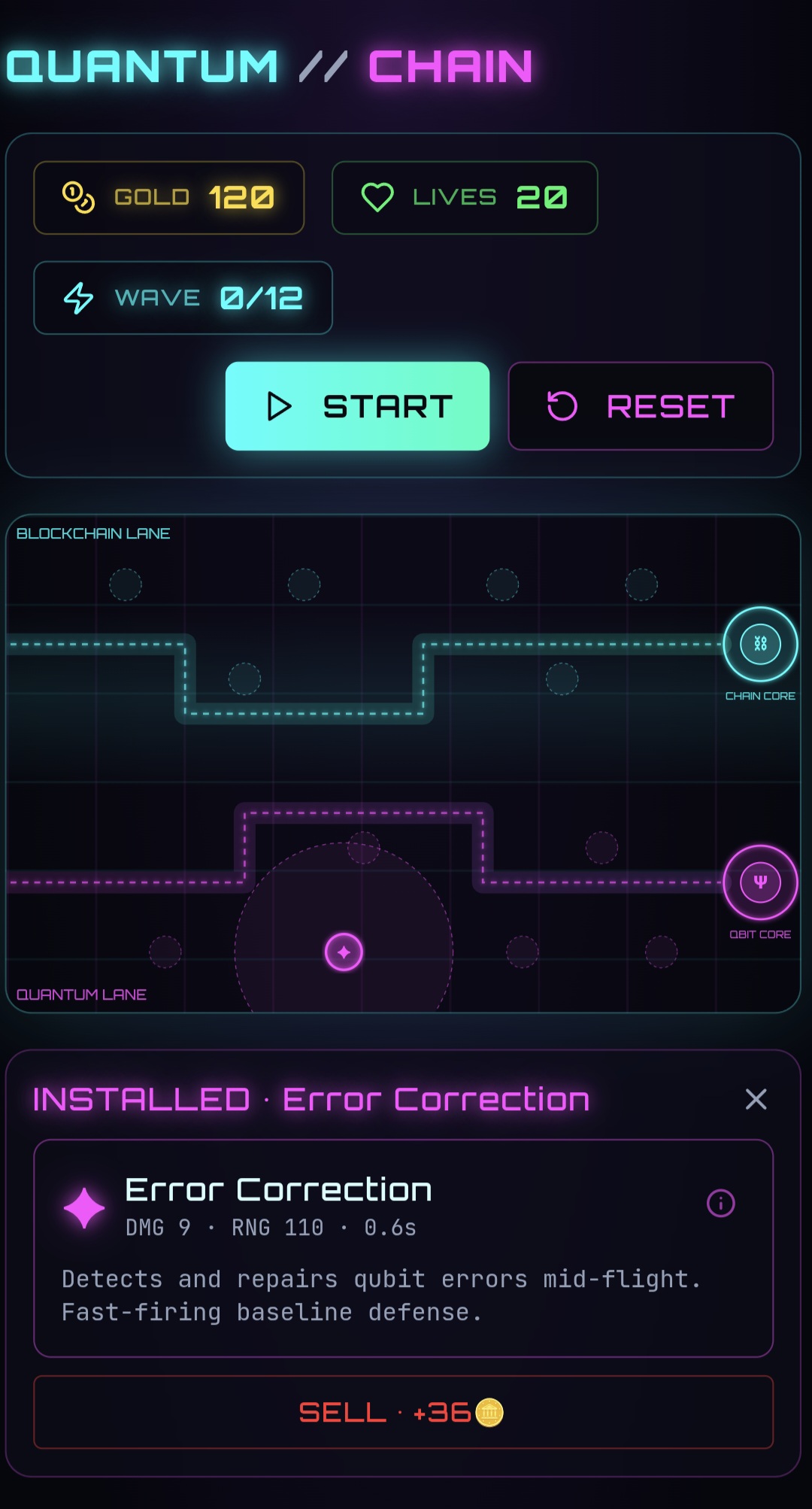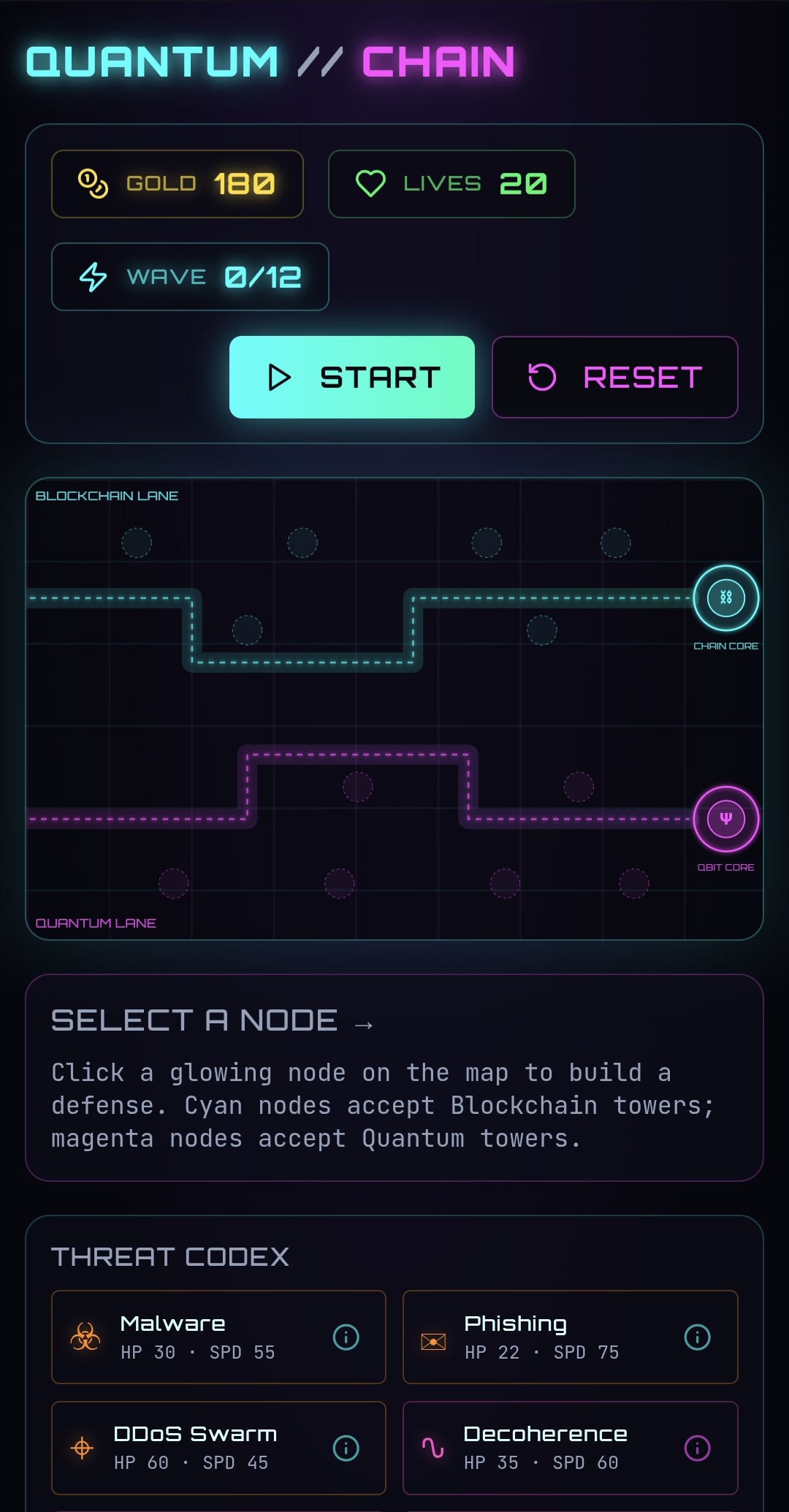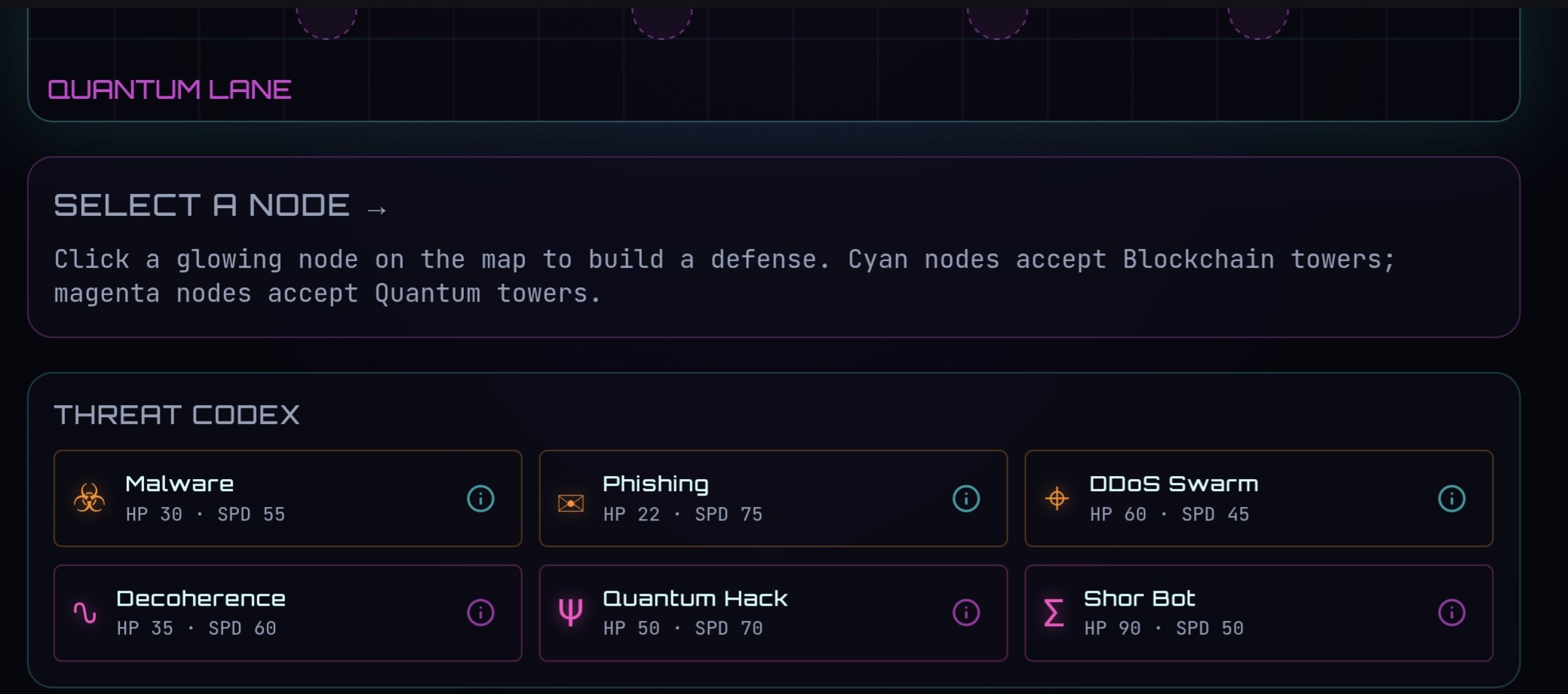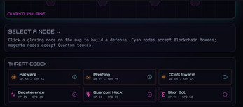 Quantum Blockade Defender is a cyberpunk tower defense game where you protect two critical resources: blockchain nodes and quantum computers.